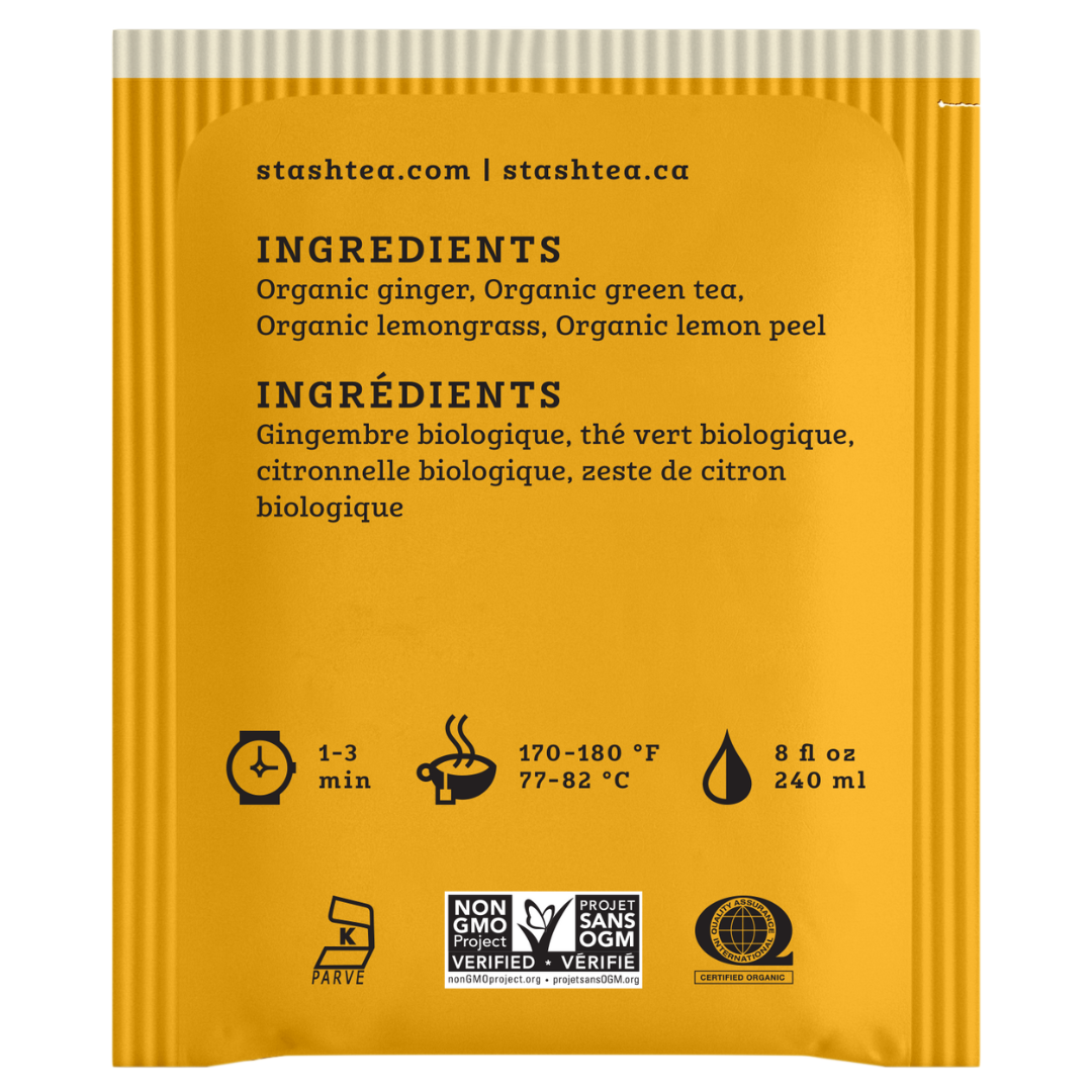 - Organic ginger, organic green tea, organic lemongrass, organic lemon peel